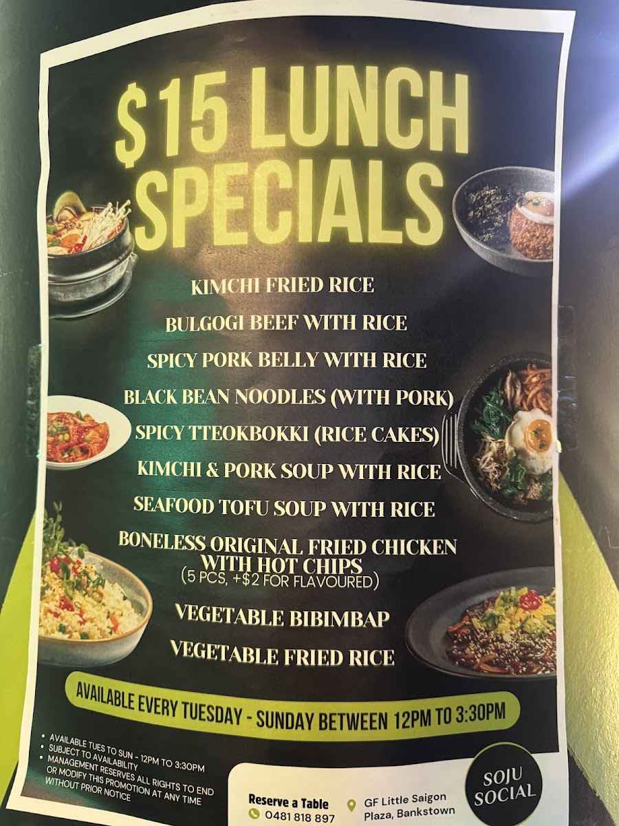 Soju Social brings authentic Korean flavors to Bankstown’s vibrant Little Saigon Plaza, offering a menu that tantalizes the senses with bold, comforting dishes. The standout Korean fried chicken is a must-try, with choices ranging from the original crunchy coating to the fiery Extra Spicy and the sweet-tangy Mala Mala glaze. Fans praise the generous portions and variety, perfect for sharing or a hearty meal. Their Korean pancakes, especially the Kimchi Pork Belly and Seafood varieties, deliver a crispy yet tender texture that balances savory and fresh flavors beautifully.